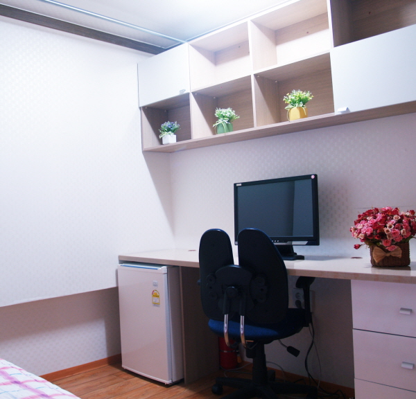 90리터 냉장고,다 채널 유선 방송 시청 가능함. 인체공학적 책상과 의자.