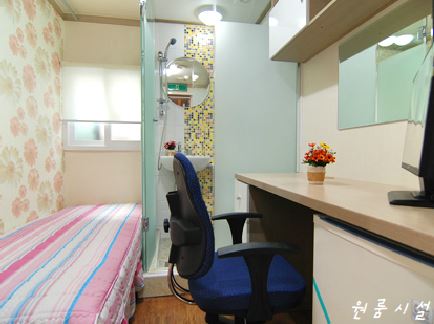 *원룸시설-각방마다 화장실 겸 샤워실 있으며 24시간 온수제공